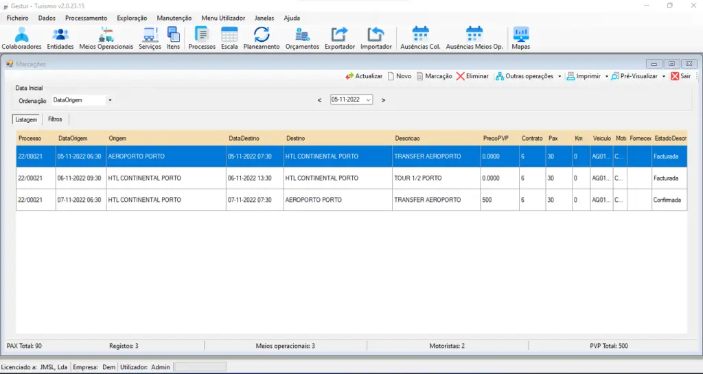 A gestão da escala de autocarros é simples e flexível, com múltiplos filtros por data, cliente, veículo, processo, entre outros, facilitando a pesquisa e organização dos serviços. O sistema apresenta referências rápidas de motoristas e veículos ainda por escalar, bem como o total a faturar, permitindo uma visão imediata do estado da operação. É possível visualizar claramente os serviços confirmados, agendados, anulados ou em orçamento, assim como registar serviços regulares, como transportes de fábricas ou escolares.